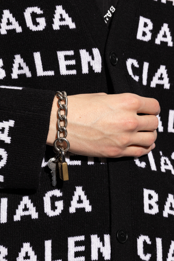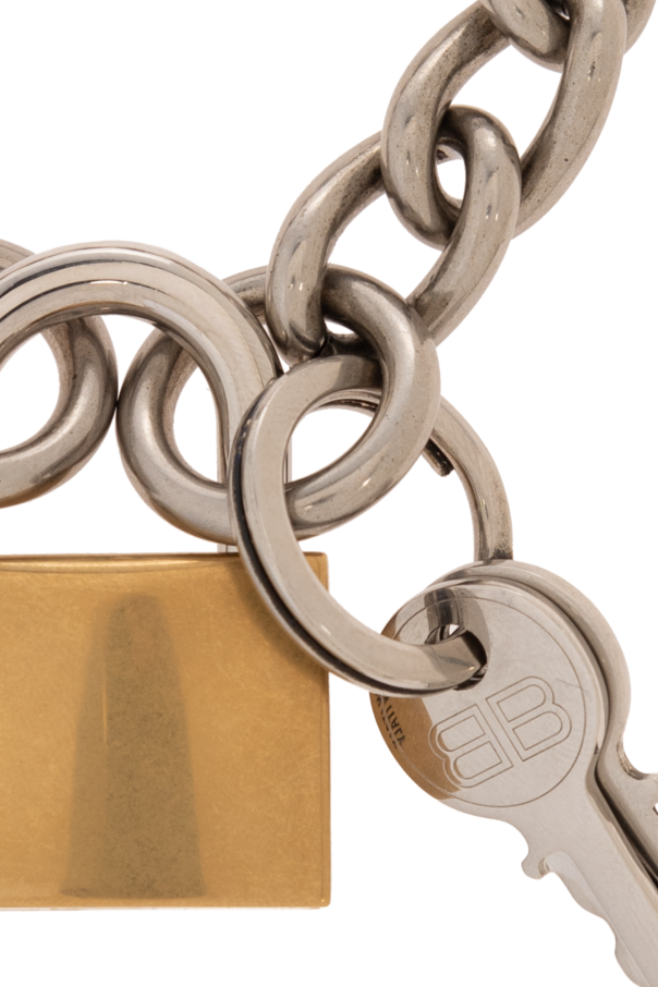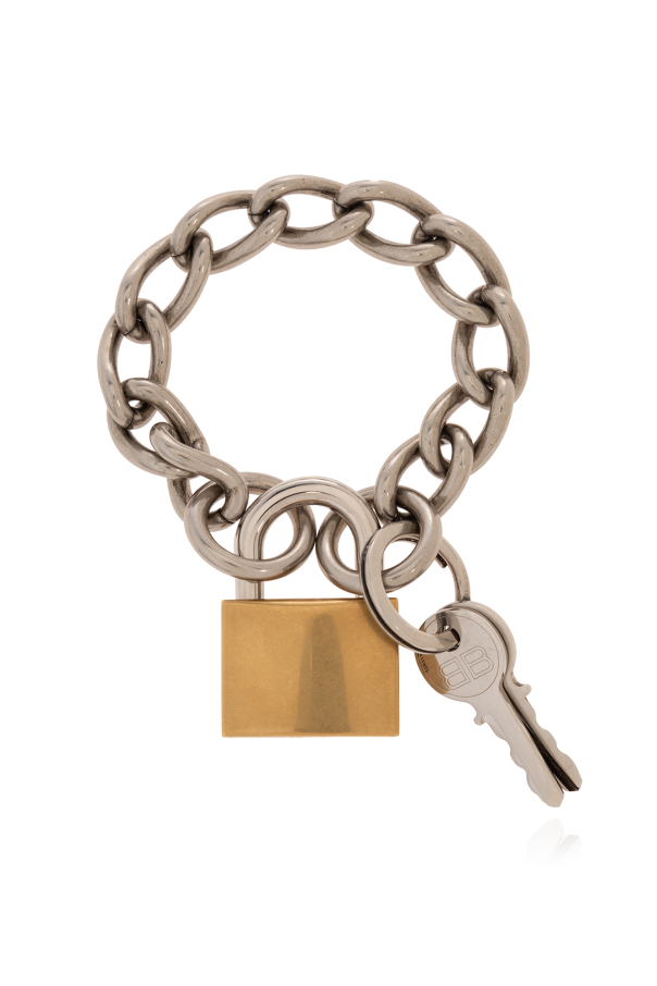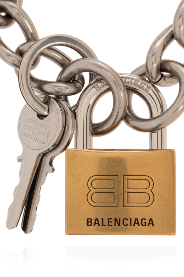 Silver-tone bracelet from Balenciaga. Made of brass, this design features a padlock and logo-engraved keyrings.