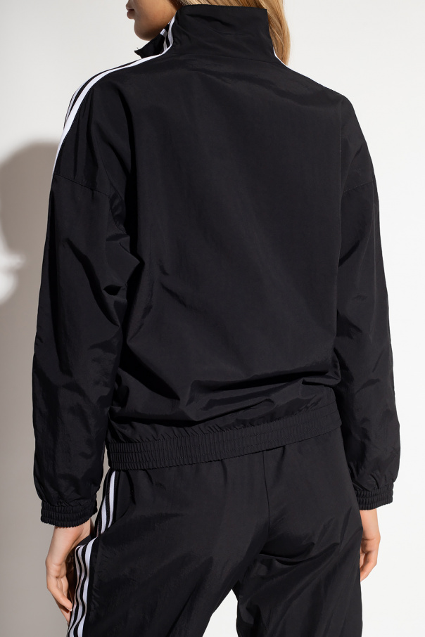 Black track jacket with a standing collar from ADIDAS Originals. Made of Primegreen, a series of high-efficient recycled materials, this style features a zip fastening, two front zip pockets, elasticized edges and an embroidered white logo and sewn-on the brand's signature three stripes.
