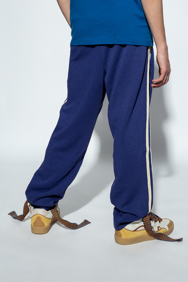 Navy ribbed trousers from ADIDAS Originals x Wales Bonner. Crafted from wool, this pair features a drawstring waist, orange logo embroidery, two slip pockets, the iconic three stripes and elasticated cuffs. This timeless collection is inspired by the ‘80s, collegiate leisurewear and independent thinking.