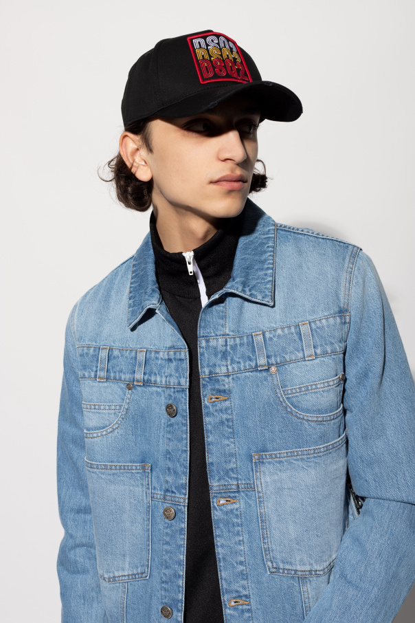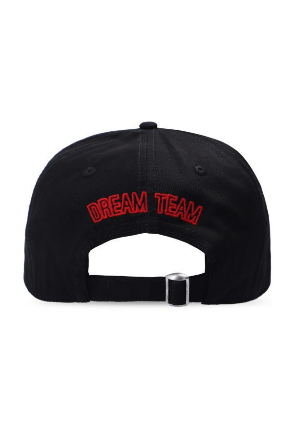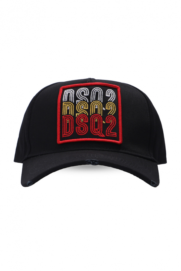 Black baseball cap from Dsquared2. Crafted from cotton, this item showcases a red, yellow and white logo patch, red graphic embroidery at the back and an adjustable buckle strap.