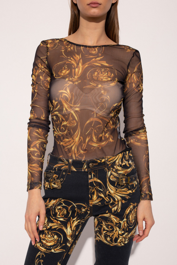 Black bodysuit from Versace Jeans Couture. Crafted with a semi-sheer finish, this style showcases the brand's iconic Barocco print, long sleeves, deep cut-out detailing on the back and hook & eye closures on the bottom.