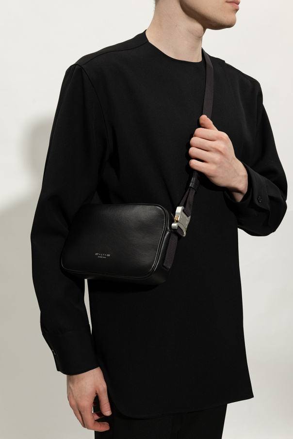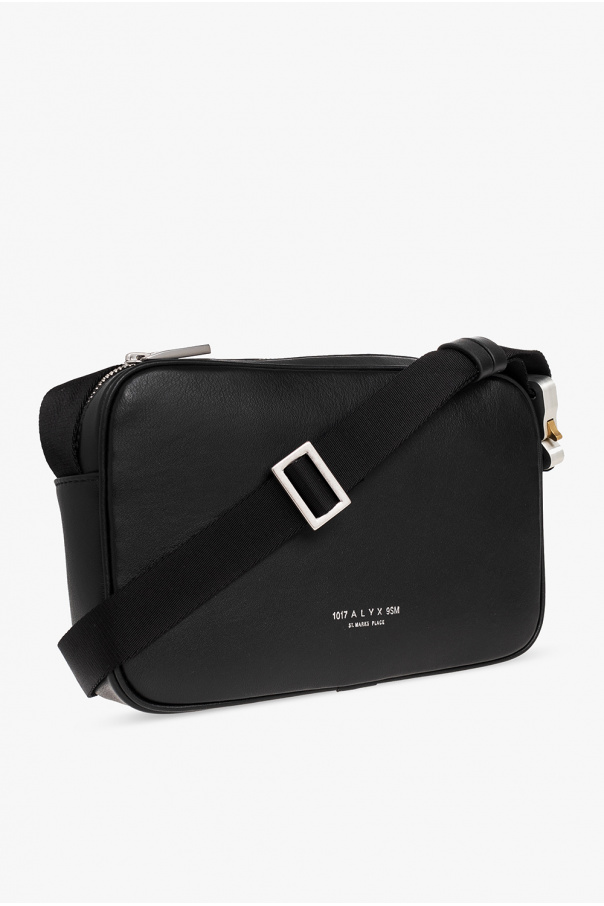 Black shoulder bag from 1017 ALYX 9SM. Crafted from leather, this design secures with a zipper and showcases a printed gold-tone logo on the front. It is complete with an adjustable nylon strap with the brand's signature Rollercoaster buckle in silver-tone and gold-tone, and one internal compartment with a slip pocket.