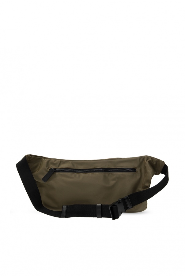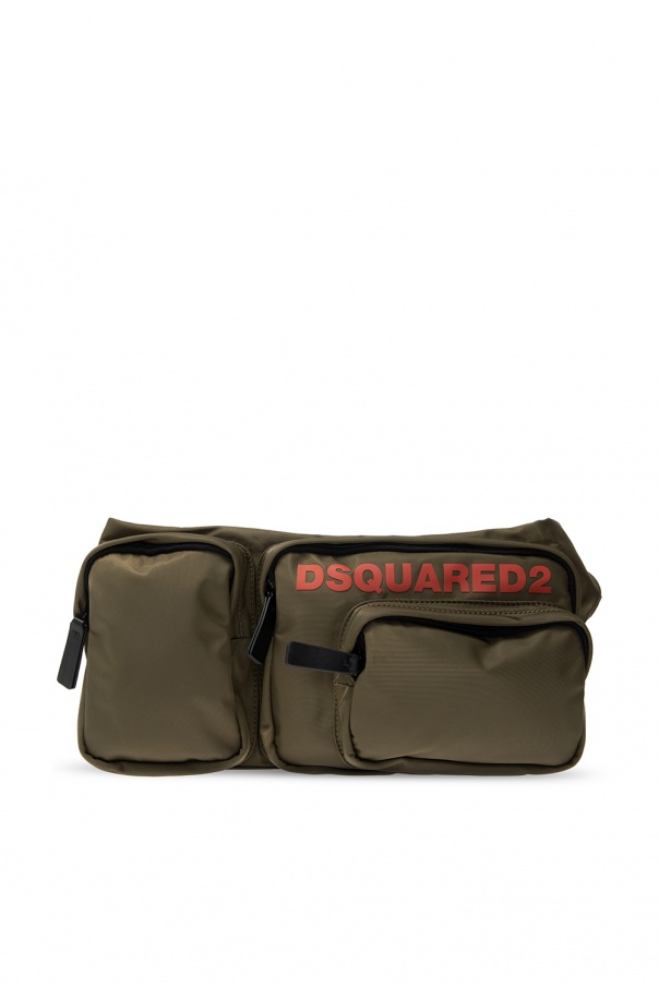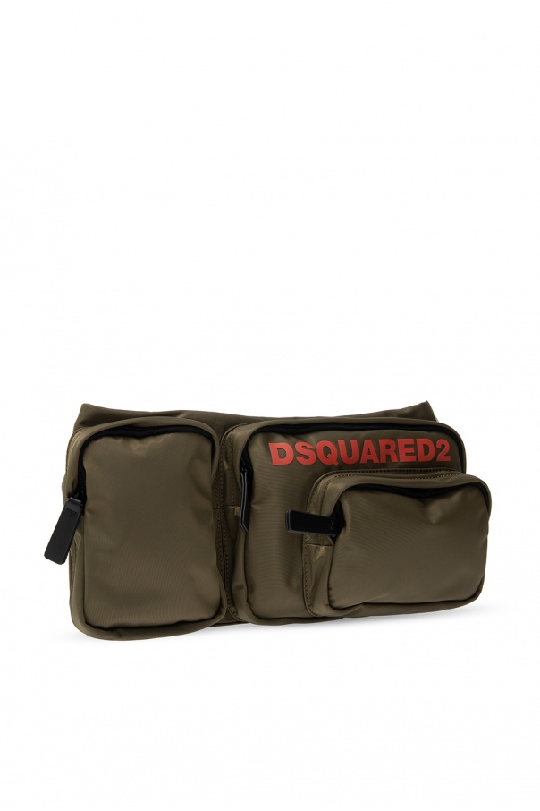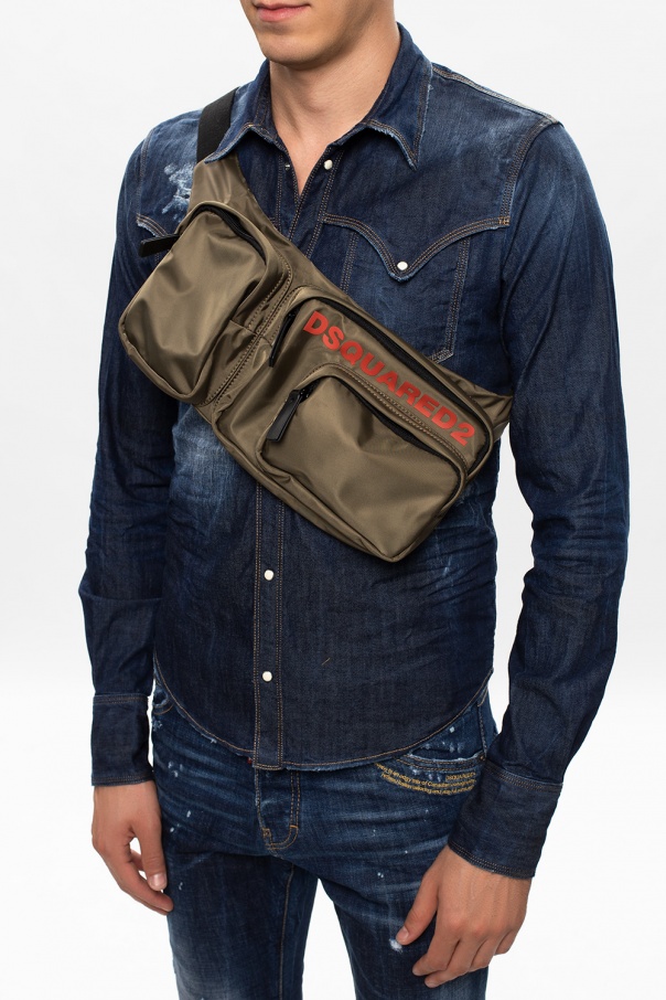 Green belt bag from Dsquared2. Trimmed with calf leather, this item features three zipped compartments, orange logo print, back pocket, adjustable belt, black lining and a main internal compartment.