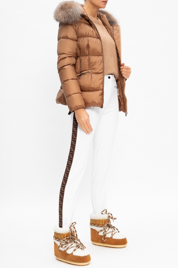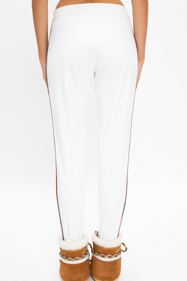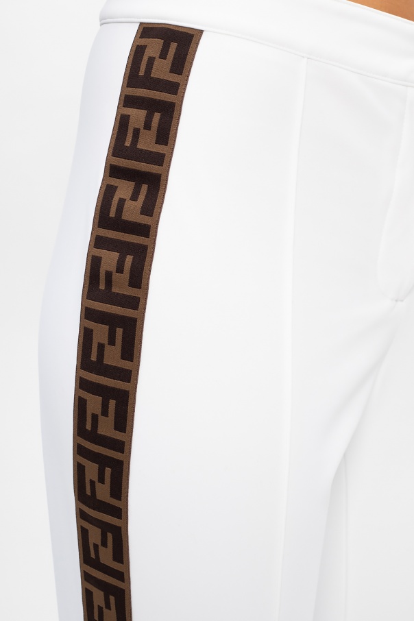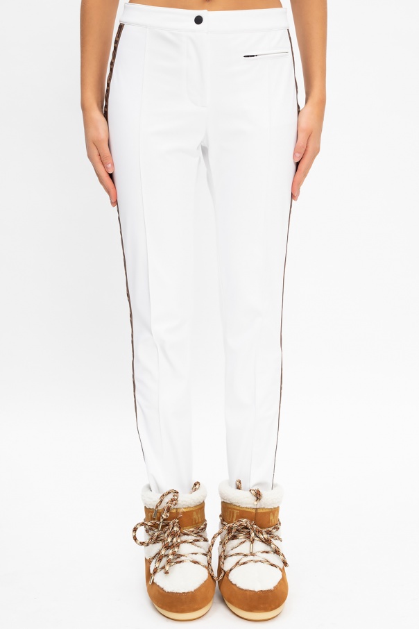 White ski trousers from Fendi. Fastened with a zip and snap, this design features elastic stirrups and brown side stripes embroidered with a logo pattern.