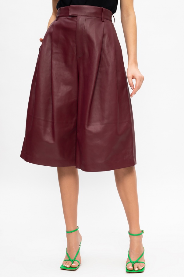 Burgundy 3/4 length trousers from Bottega Veneta. Crafted from lamb leather, this wide leg design features zip, hook and button fastening, two front slip pockets and two back flap pockets.