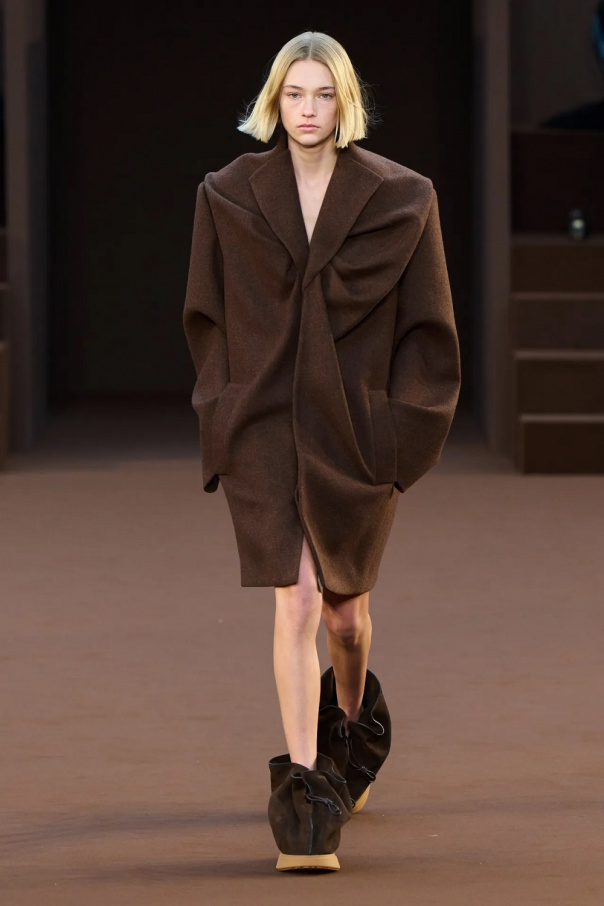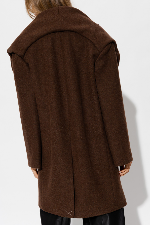 Brown oversize coat from Loewe. Made of wool, this garment features buttons with a concealed placket, draped front, lapels, collar with lapels, two slip pockets, long sleeves and single rear vent.