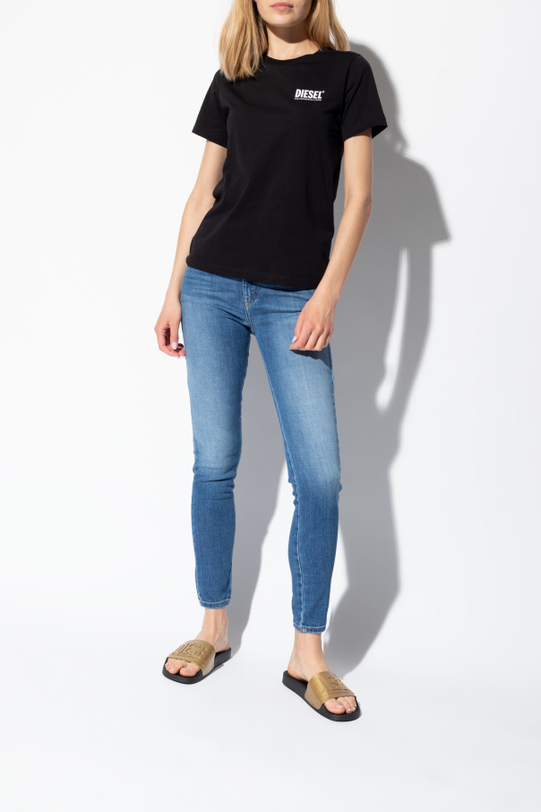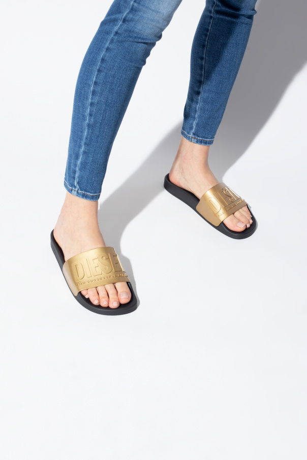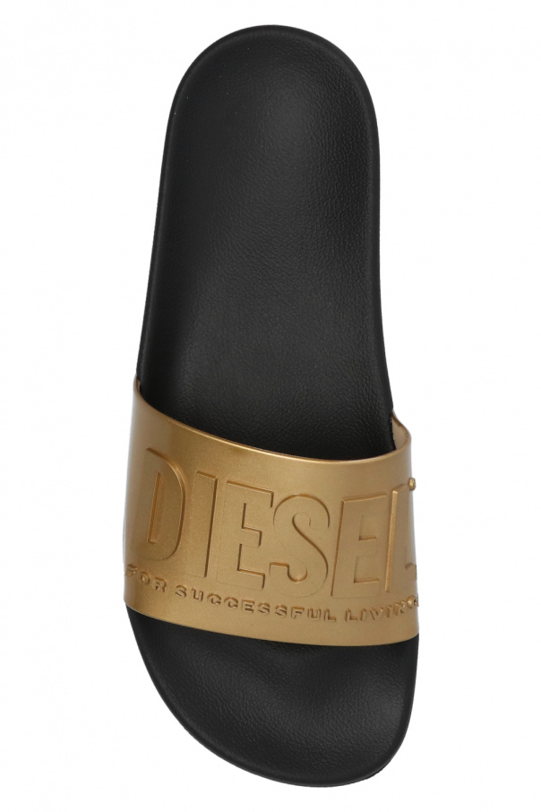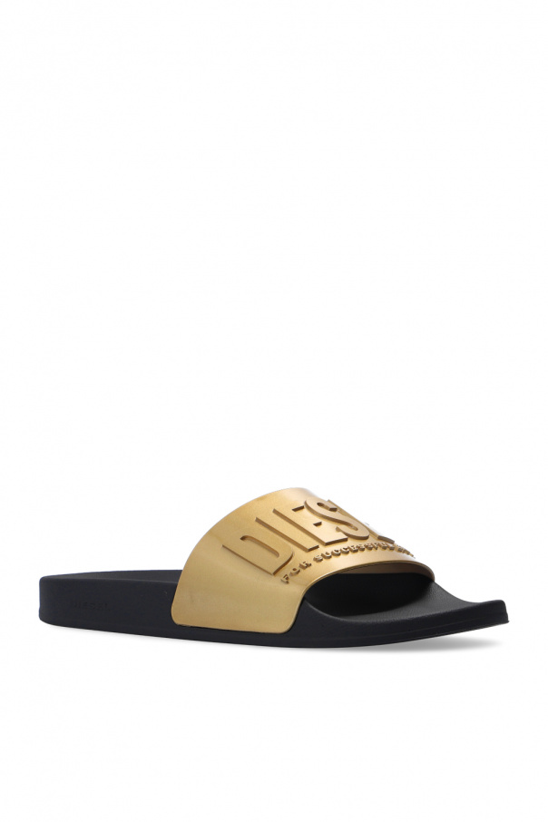 Black and gold-tone ‘Sa-Mayemi’ slides from Diesel. Set on a black rubber sole, they showcase a tactile logo embossed on the upper band.