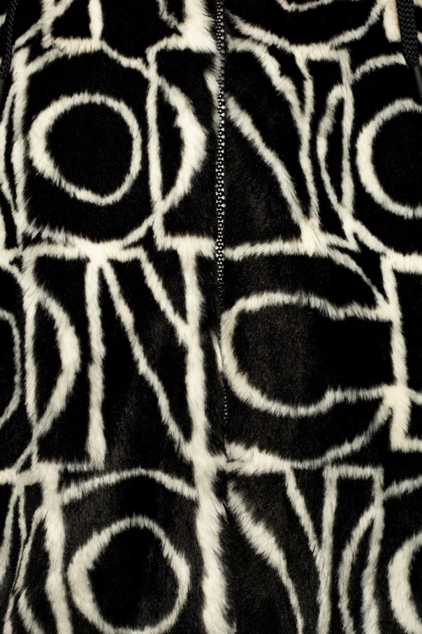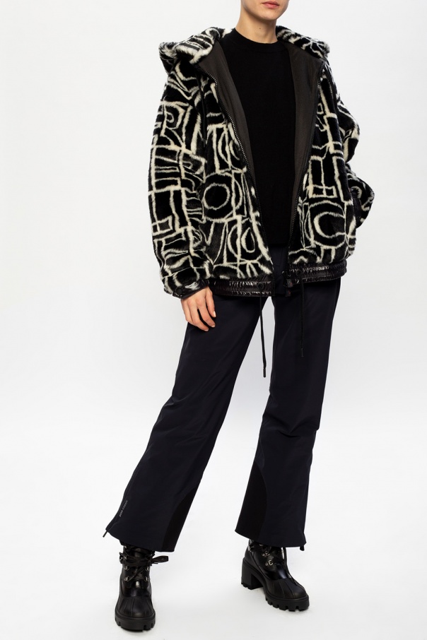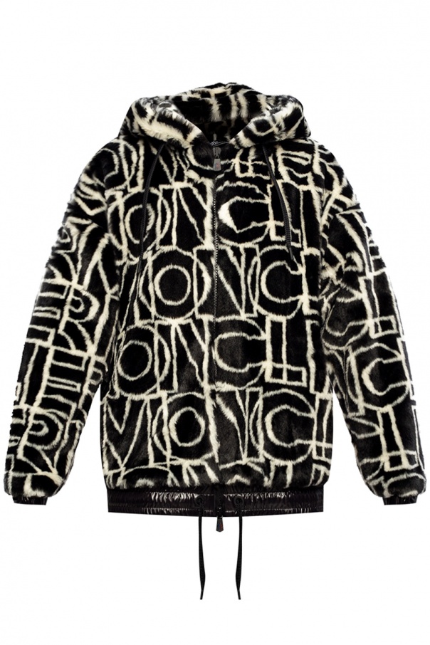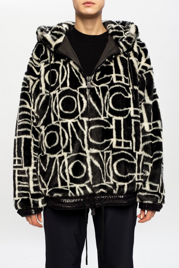 Black and white ‘Maglia’ hooded jacket from Moncler Grenoble. Fastened with a two-way zip, this garment features a drawstring hem, faux fur trim with a logo detail, drawstring hood, two front snap pockets and long sleeves with a colorful logo patch.