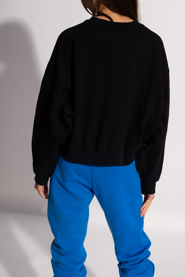 Black crewneck sweatshirt with ribbed trims from ADIDAS Originals, the ‘Blue Version’ collection. Made of cotton from sustainable ‘Better Cotton Initiative’ farms, this garment showcases the label’s logo patch and signature three side stripes. The Blue Version collection explores Originals' DNA, recoding its most iconic elements for today, all inspired by the signature Bluebird colorway.