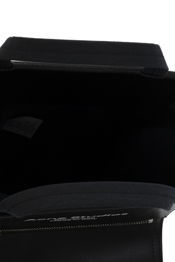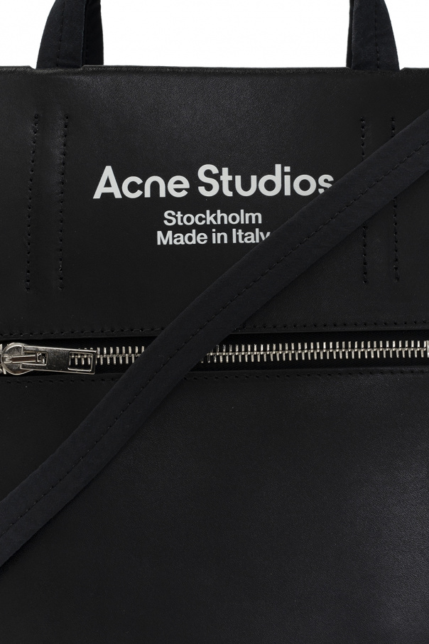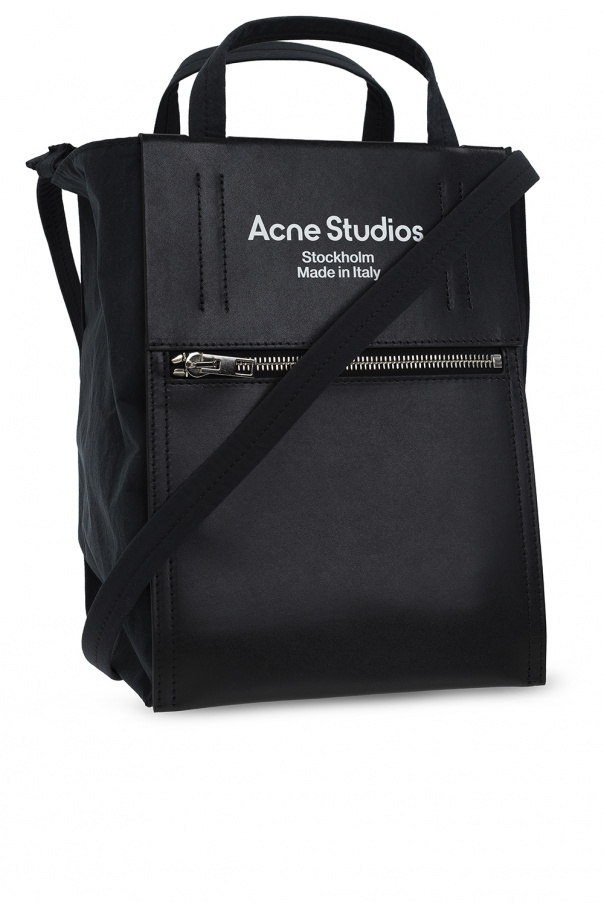 Black ‘Baker Out Mini’ shoulder bag from Acne Studios. Trimmed with calf leather, this design features a white logo print, front zip pocket, two half-round handles and one internal compartment as well as a detachable and adjustable shoulder strap.