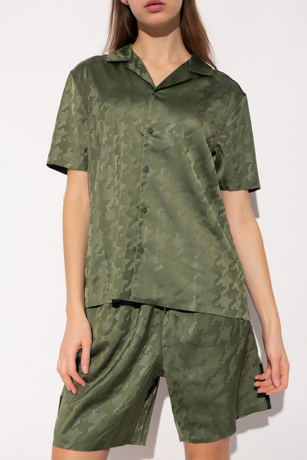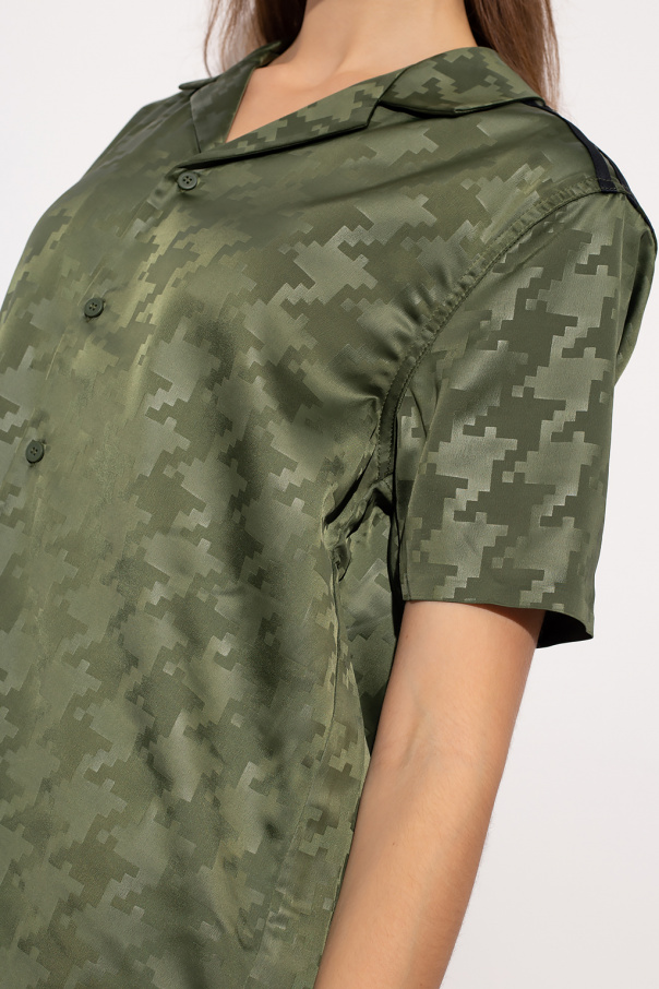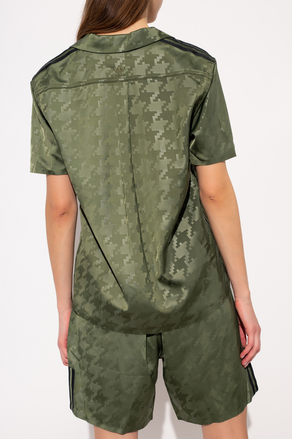 Dark green shirt from ADIDAS Originals x Ivy Park. Fastened with buttons, this short sleeve design is decorated with a geometric pattern and the iconic stripes in black.