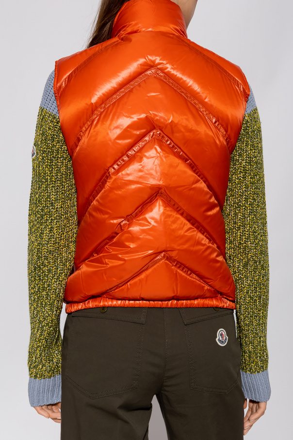 Orange ‘Hossegor’ down vest from Moncler. Crafted from light Longue Saison nylon, this design features a two-way zip, snap-fastened stand-up collar, chevron quilting, logo patch, two snap-fastened flap pockets and ribbed hem.