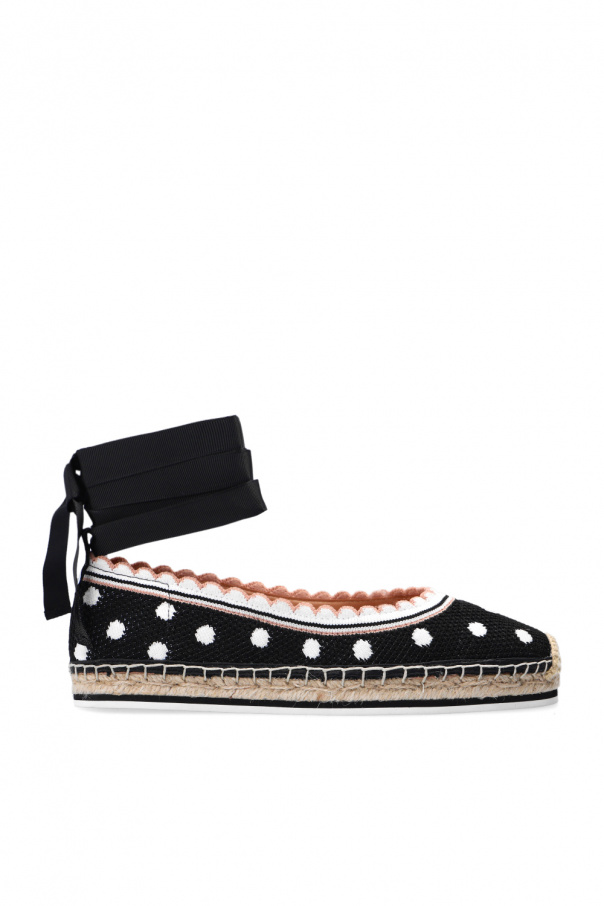 Black, beige and white 'Knottingham' knit espadrilles from Kate Spade. Embellished with embroidered dots and logo in white, this pair sits on a white rubber sole and features leather trims and a tie fastening at the ankle.