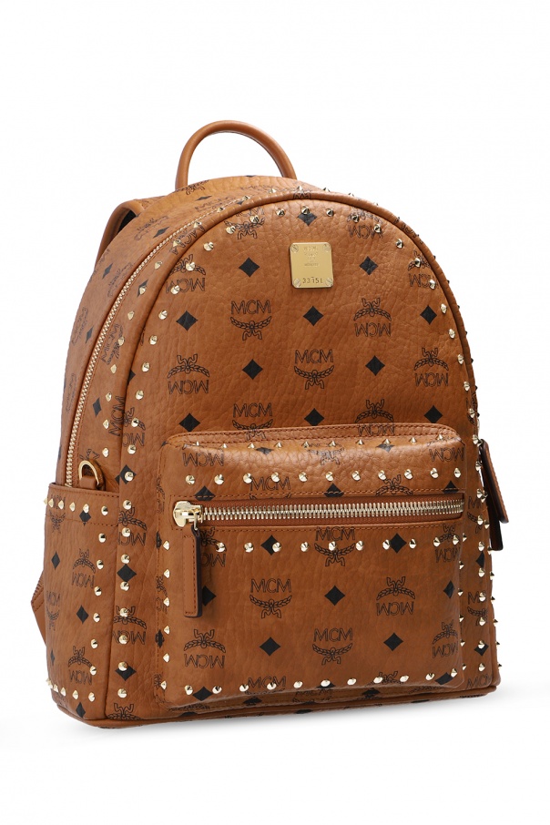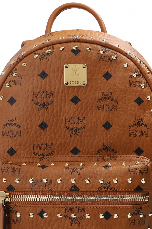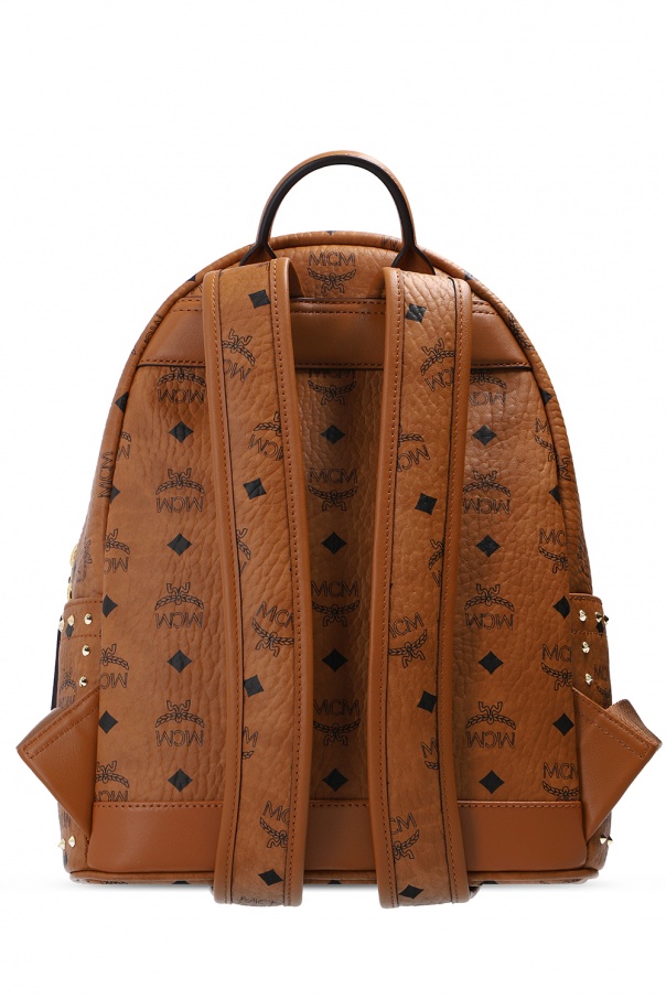 Brown backpack from MCM. Crafted from canvas, this item is enhanced by a black monogram print, distinctive details and gold-tone hardware with the label's logo. It also features two-way zip fastening, zip pocket on the front, two slip pockets on the sides, a half-round top handle, detachable and adjustable shoulder straps and interior with one compartment and two slip pockets.