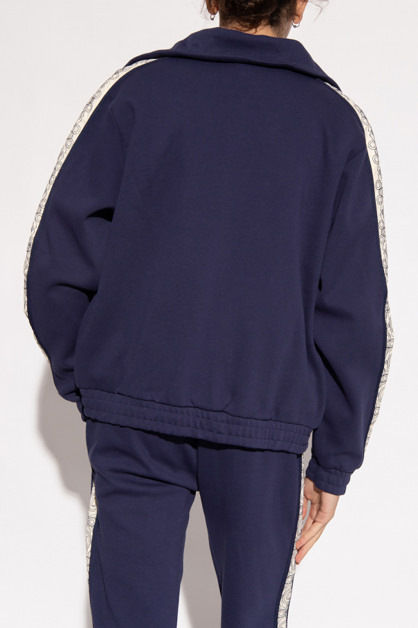 Navy track jacket from PUMA x Palomo Spain. Made of at least 20% recycled cotton, this garment features a two-way zip, logo patch, cream stripe embroidered with a logo pattern running down the long sleeves, two zip pockets and ribbed edges. The PUMA x Palomo collection tells the story of ‘a sports icon in the ideal world’. Lifting inspiration from the signature styles of the ‘70s, it focuses on a ‘70s-inspired palette and big graphic design details. Premium, genderless apparel and sneakers represent the fluidity of the modern day while referencing the best styles of sporting history.