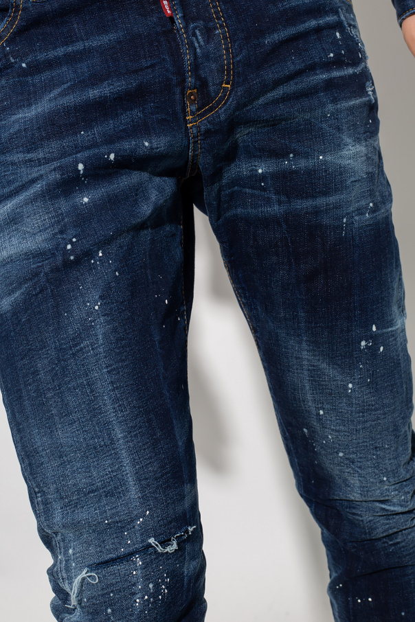 Navy blue ‘Sexy Twist’ jeans from Dsquared2. Made of cotton, this pair falls with tapered legs and features button fastenings, classic five pockets, a distressed treatment, paint splatters and a red and black logo patch at the back.