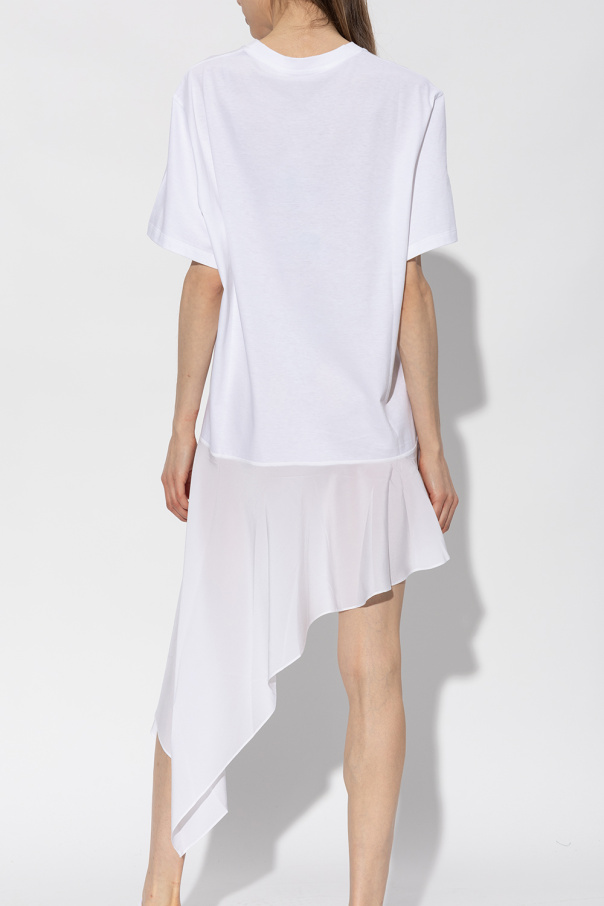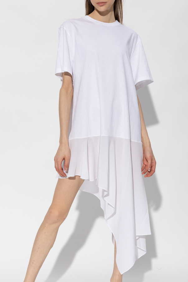 White dress from Stella McCartney. Crafted from cotton with a relaxed fit, this style features an elasticated round neck, short sleeves and an asymmetrical hem with a silk ruffle.