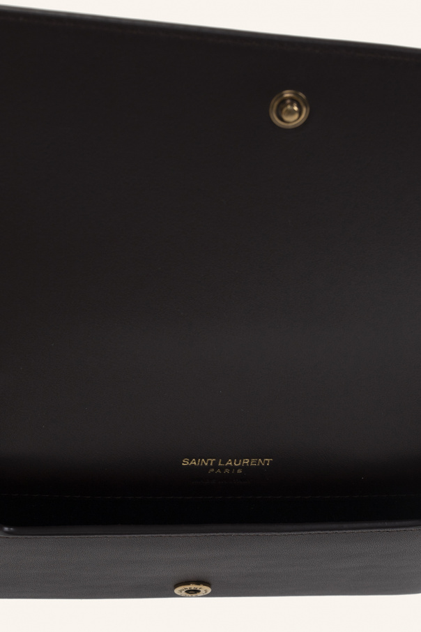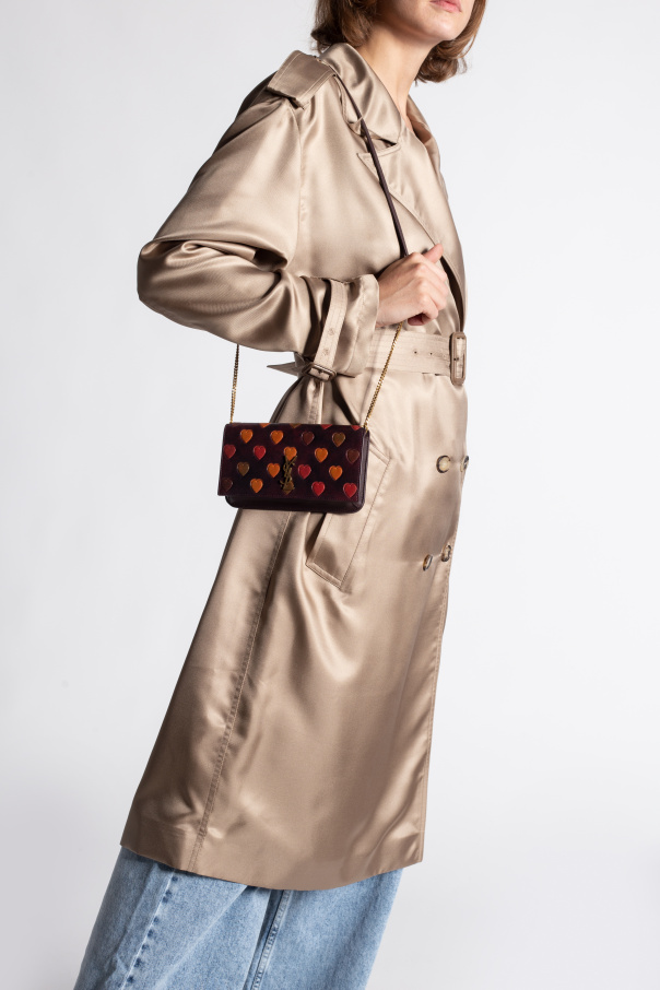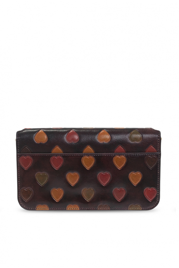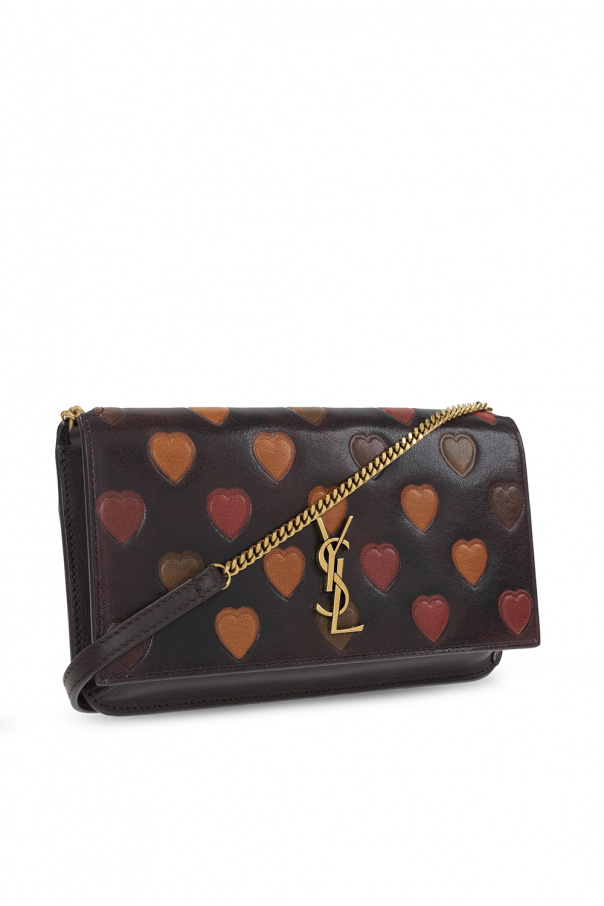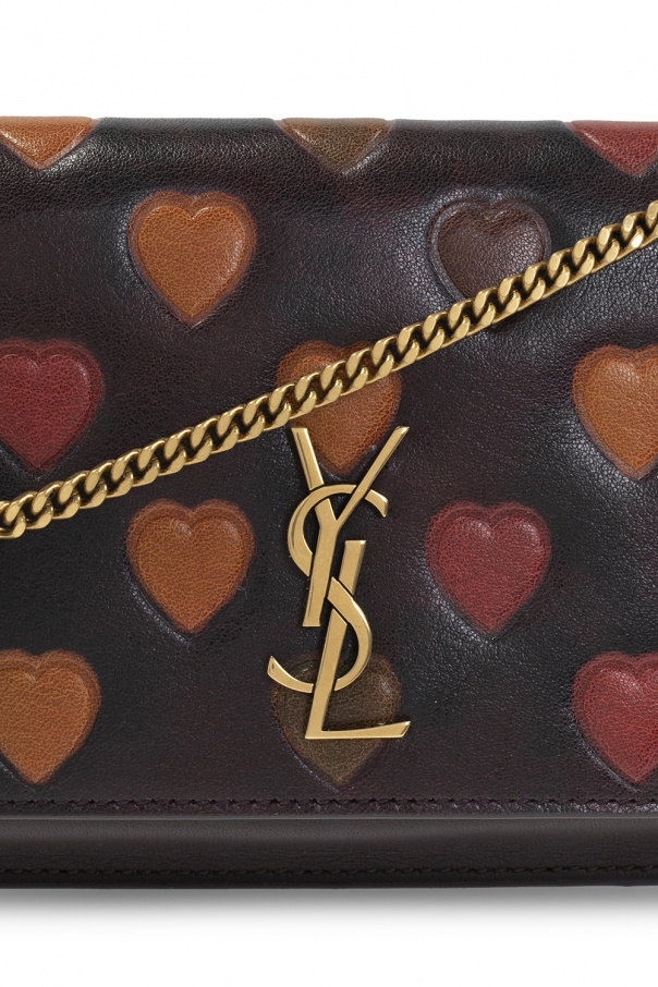 Brown phone holder from Saint Laurent. Crafted from calf leather, this item showcases a colourful pattern with a motif of a heart, gold-tone metal initials on the front, a chain-reinforced strap, one internal compartment and gold-tone metal hardware.