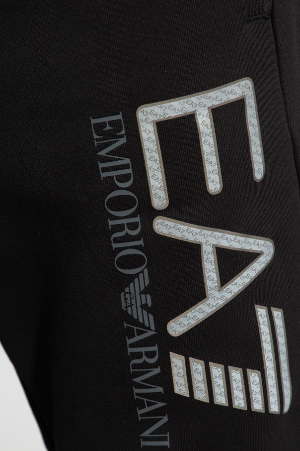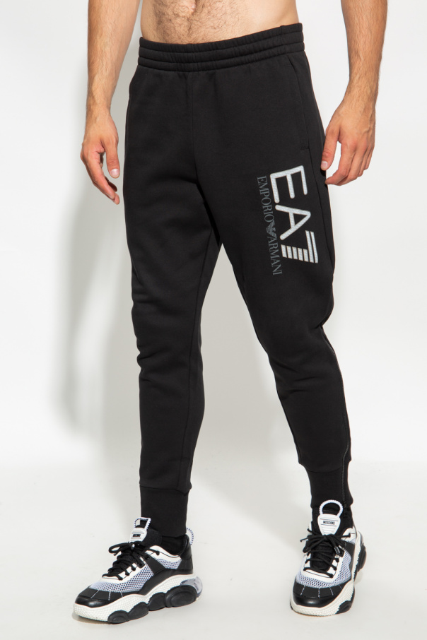Black sweatpants from EA7 Emporio Armani. Made from cotton, this pair features a drawstring waistband, two slip pockets, a reflective logo on the front, reflective silver-tone inserts with a logo and elasticated cuffs with zippers.