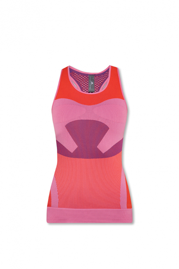 Pink, red and navy blue seamless training top from ADIDAS by Stella McCartney, the ‘End Plastic Waste’ line. Crafted from partially recycled materials, this style features a slim-fitting silhouette with navy blue logo embroidery, a distinctive graphic pattern and an openwork mesh back.