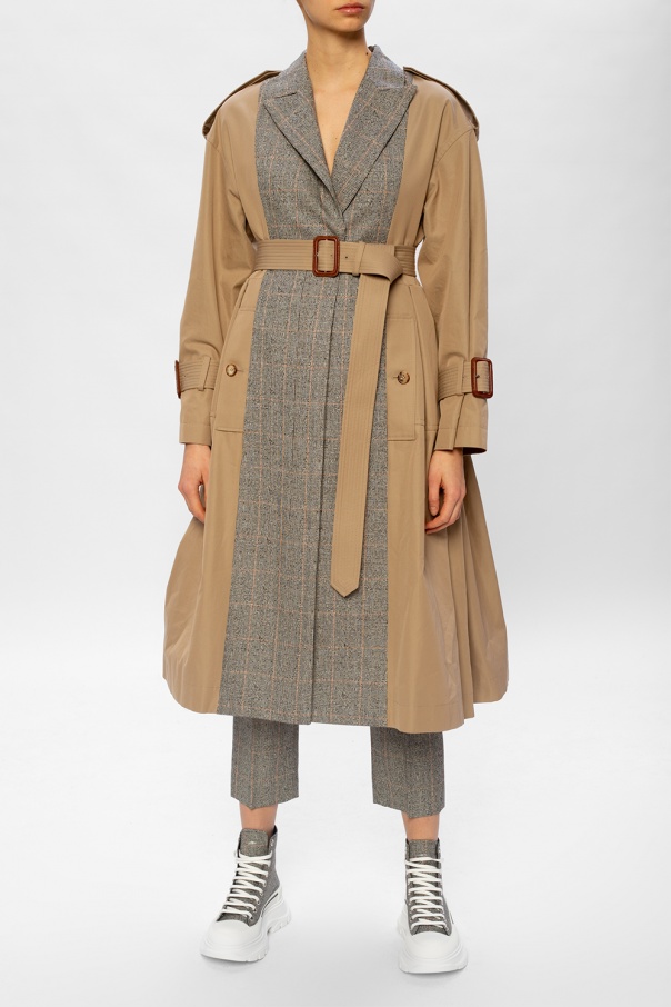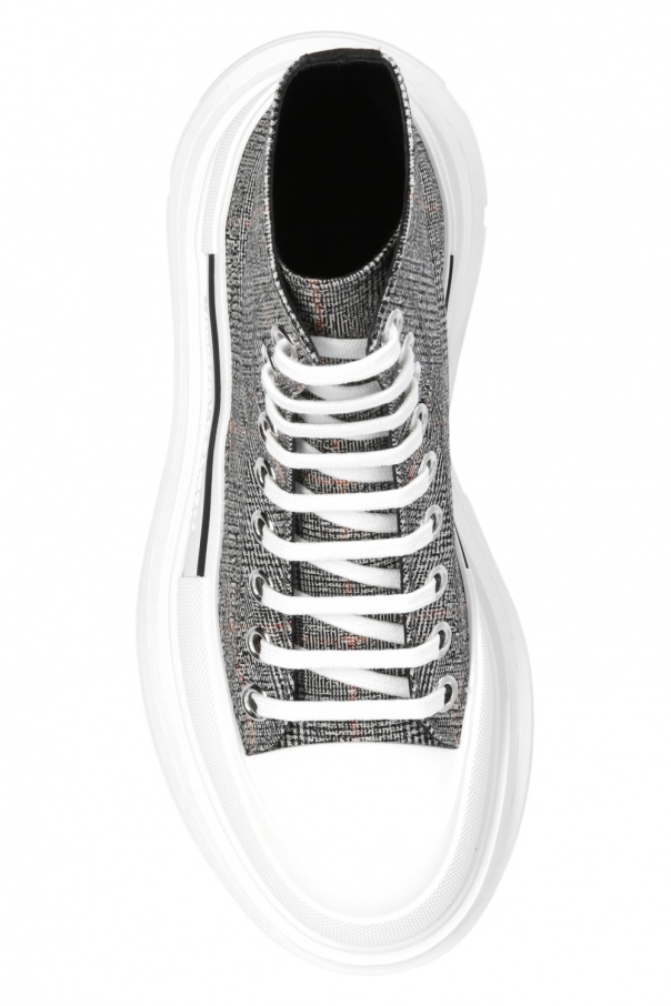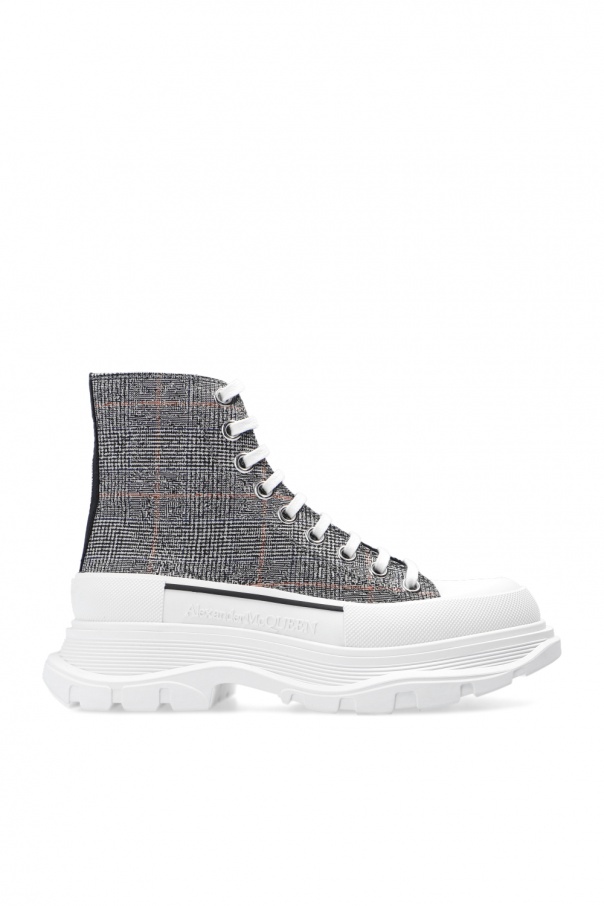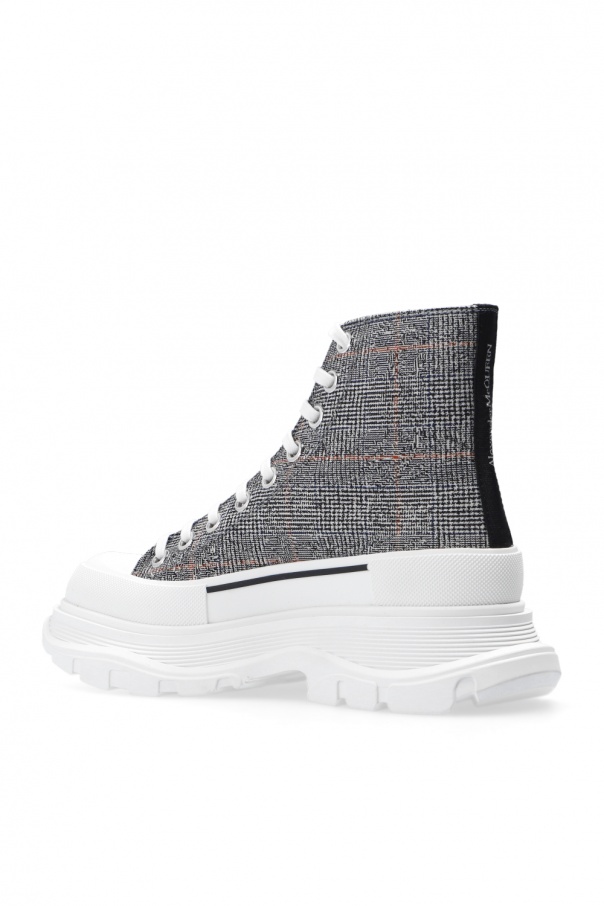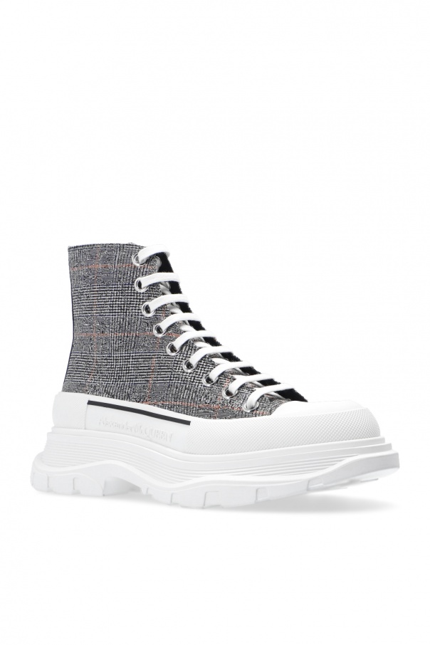 Black, white and red ‘The Tread Slick’ high-top sneakers from Alexander McQueen. Decorated with an embroidered check pattern, this pair is complete with a black pull strap embroidered with a white logo and a white rubber sole.