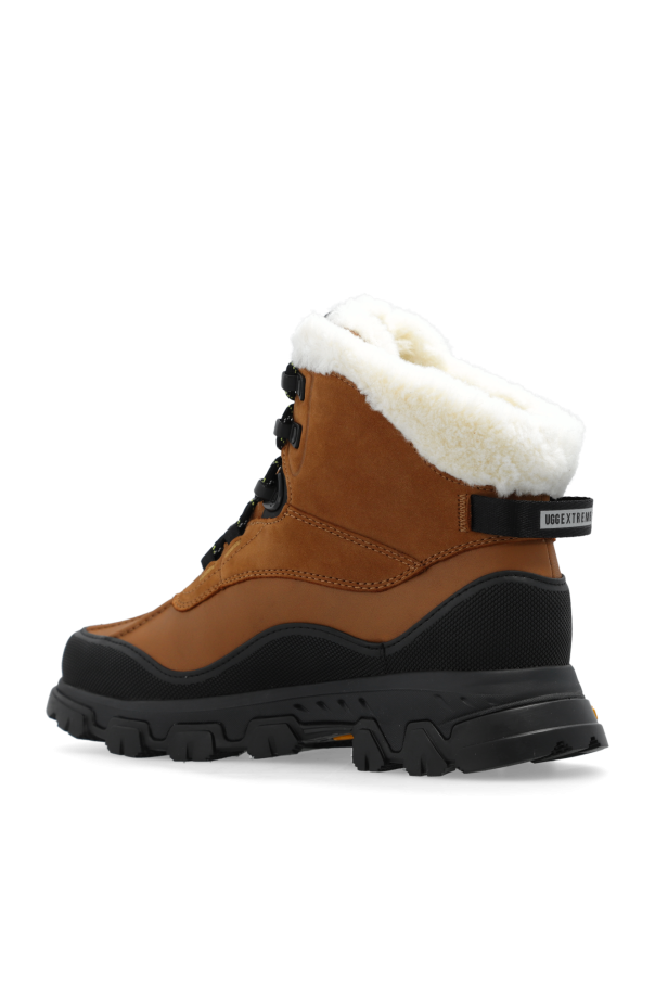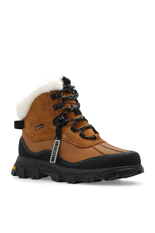 Brown and black ‘Adirondack Meridian Hiker’ snow boots from UGG. Made from waterproof suede, nubuck and leather, this lace-up model showcases the brand's logo, the signature UGGplush in the liner, a GORE-TEX internal membrane bootie, a gusseted tongue with water-repellent coating as well as a PU foam footbed which incorporates 25% of Susterra® plant-based compound and 75% PU from petroleum. The midsole incorporates 44% sugarcane. The black Vibram® outsole includes an ICETREK rubber compound, a lightweight and textured rubber mudguard and Vibram® Traction Lug technology. Weather Rated -32C.