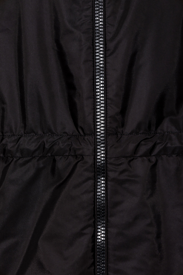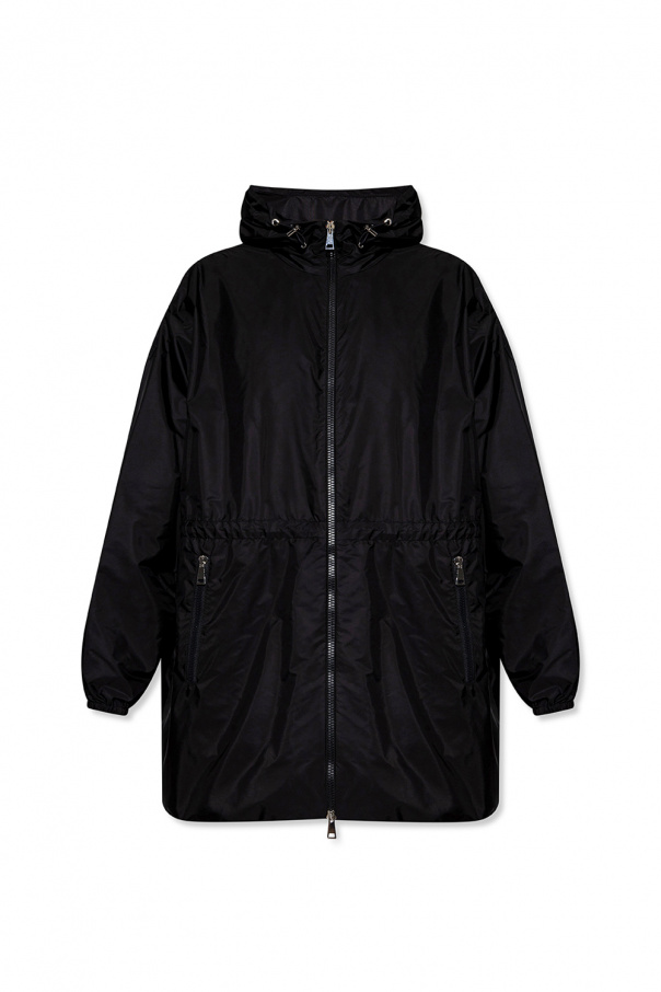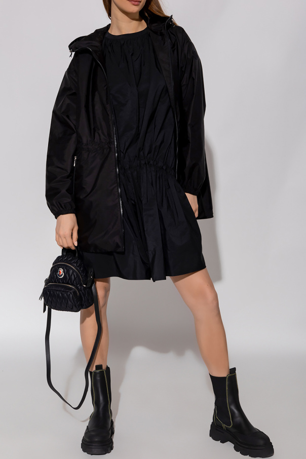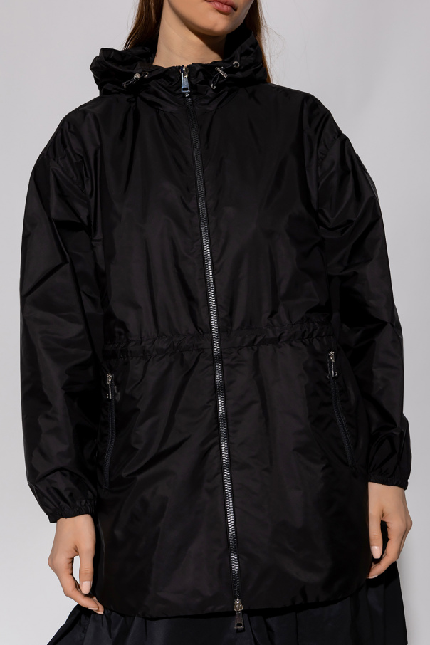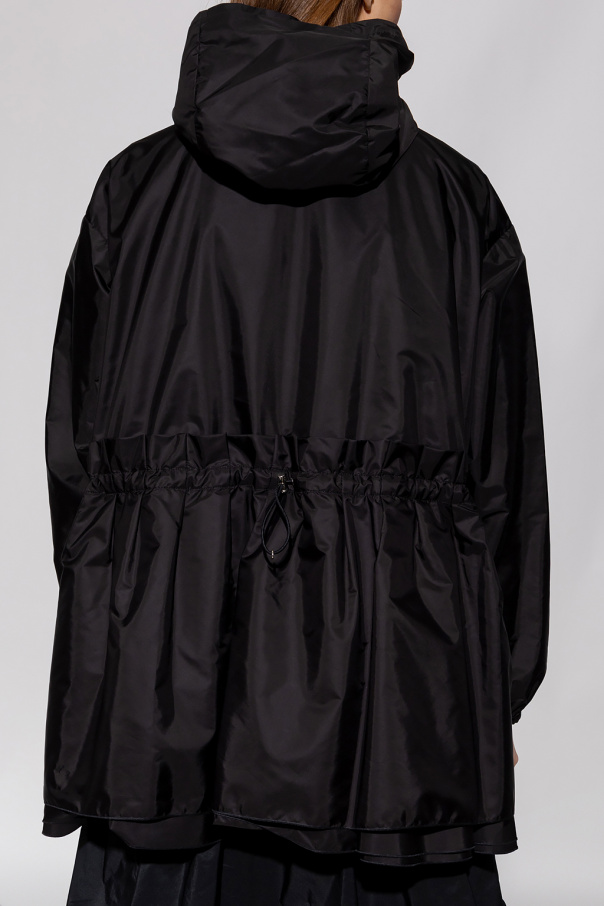 Black ‘Wete’ hooded jacket from Moncler. Fastened with a two-way zip, this garment features a logo patch, drawstring hood, two zip pockets, long sleeves with ribbed cuffs and three-layered fabric at the back with drawstrings for a ruffle effect.