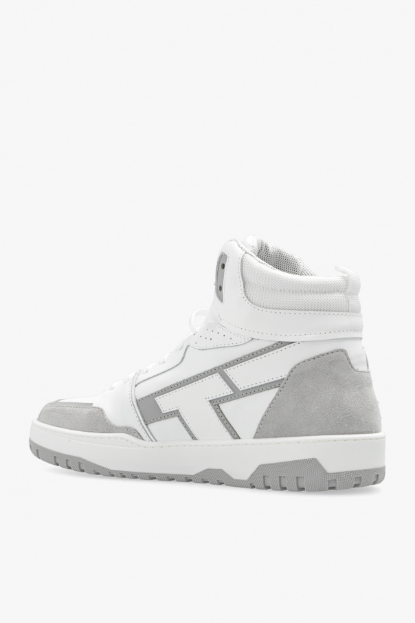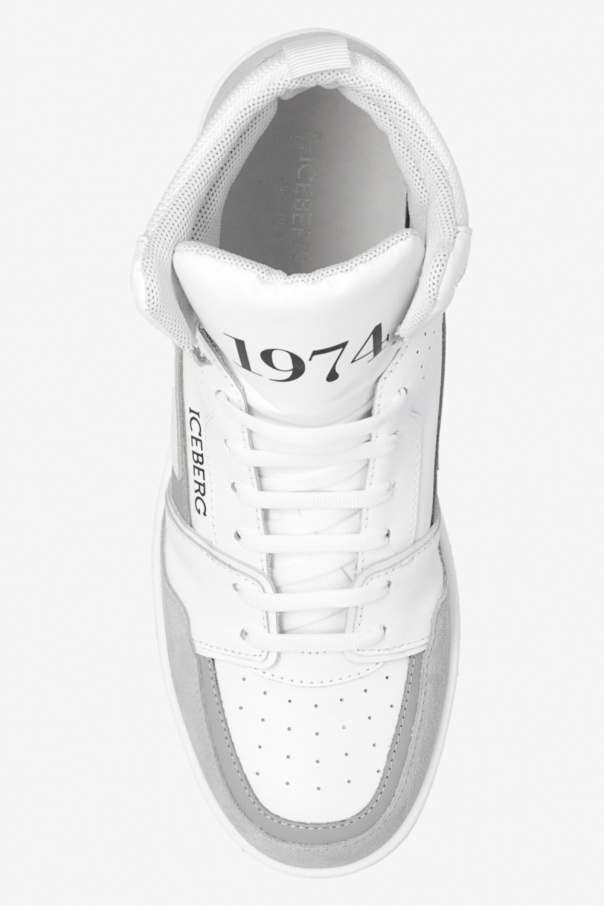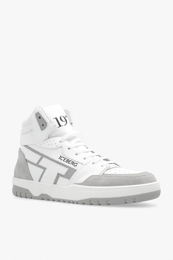 White and light grey sneakers from Iceberg. Crafted from leather with a high-top silhouette, this lace-up model features fabric overlays, decorative perforations, a printed black logo and a grey and white rubber sole.