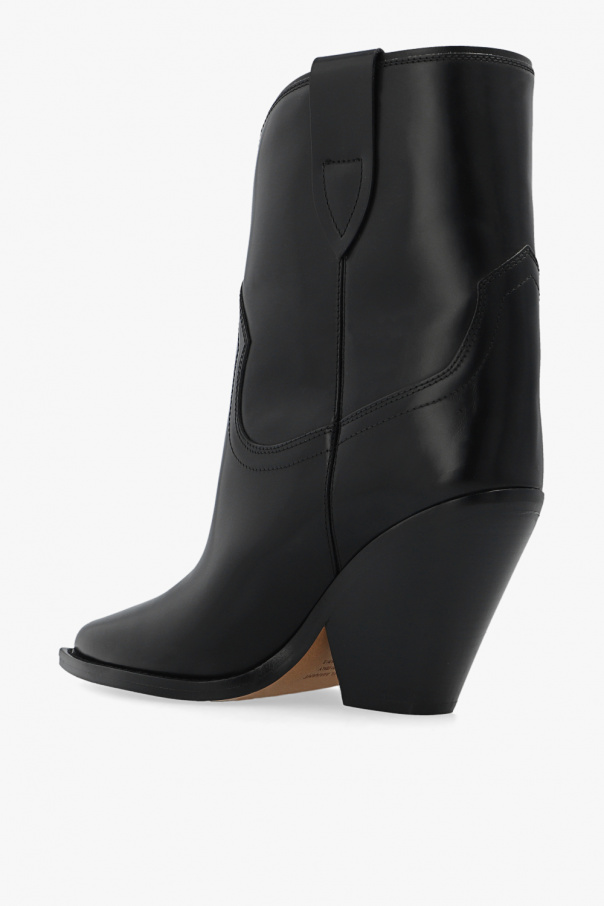 Black ‘Leyane’ heeled ankle boots from Isabel Marant. Made from smooth calf leather with a slip-on silhouette, this model sits on a beige and black leather sole and features a tapered toe silhouette.