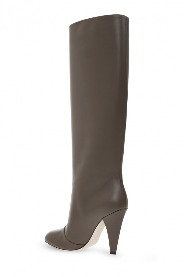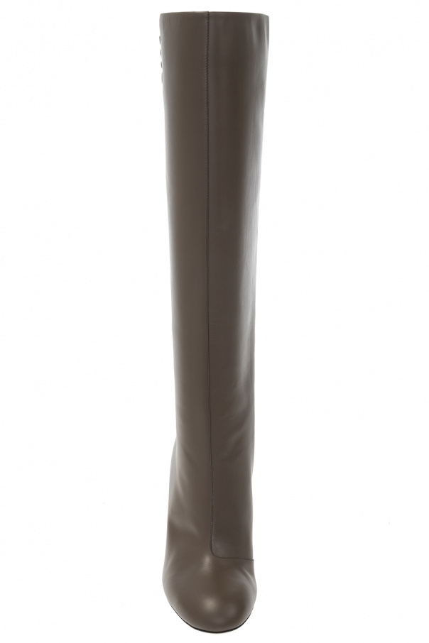 Brown ‘Karligraphy’ heeled boots from Fendi. Crafted from calf and lamb leather, this slip-on pair features a raised logo on the side and a cream leather sole.