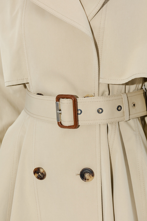 Beige double-breasted trench coat from Alexander McQueen. Made of cotton, this design features buttons, adjustable waist belt, collar with hook fastenings, storm flaps, long sleeves with adjustable tabs and flared hem with a decorative buttoned panel.