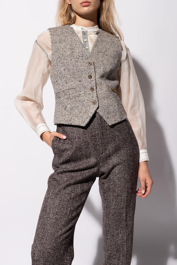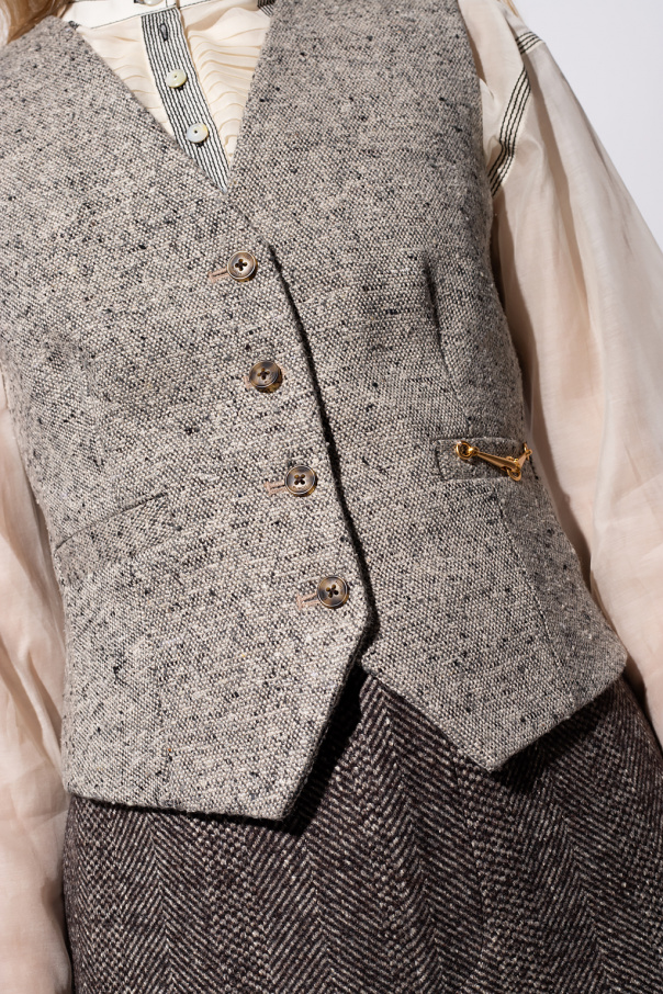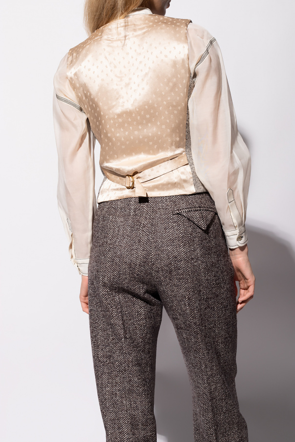 Grey and cream vest from Tory Burch. Made of wool, this V-neck design features button fastenings, two slip pockets, a gold-tone metal horsebit and a cream back panel made of silk.