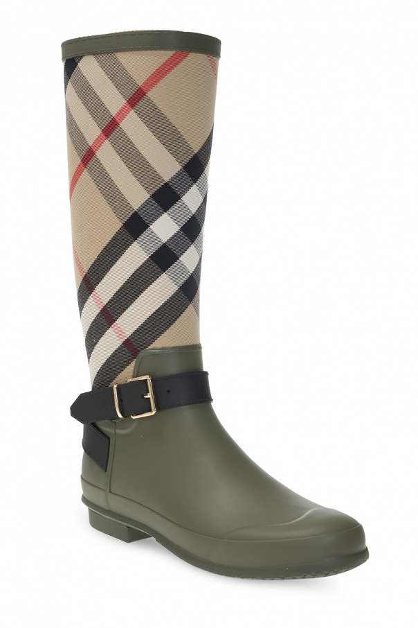 Green and black rain boots from Burberry. Finished with beige panels with the brand's iconic colourful check pattern, this model features a buckle strap fastening and a green rubber sole.