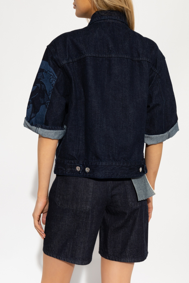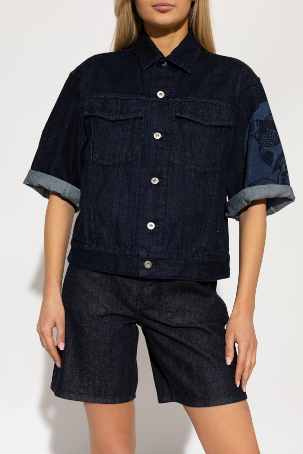 Navy blue denim jacket from Jil Sander+. With a relaxed silhouette, this style features button fastenings on the front, two welt pockets, two flapped button pockets and short, rolled-up sleeves accentuated with a blue animal print.
