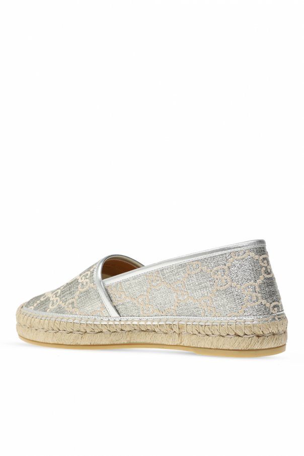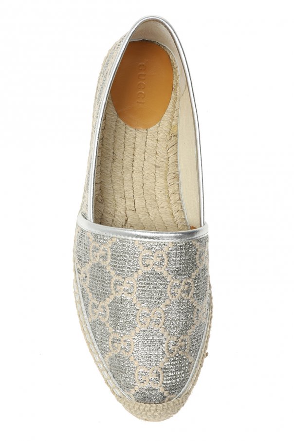 Silver-tone espadrilles from Gucci. Knitted in lurex yarn with label's signature monogram, this pair comes with leather trims and beige rubber sole at the base.
