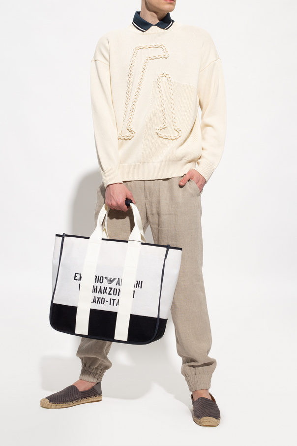 Grey and beige espadrilles from Emporio Armani. Crafted from leather and fabric, this model features logo embroidery and a beige rubber sole.