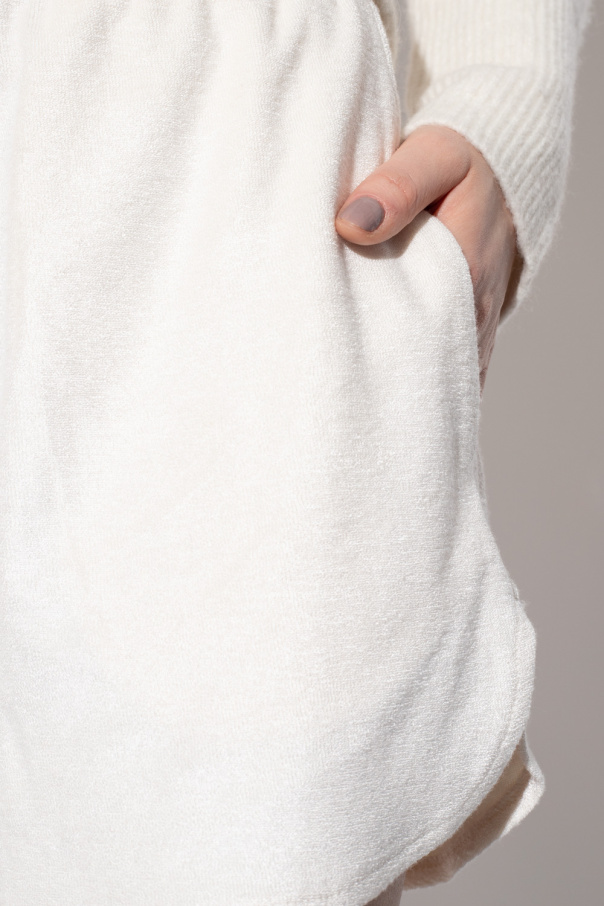 Cream ‘Eris’ shorts from Le Petit Trou. Crafted from terry-like material absorbing the moisture, this pair features an elastic waistband, two sip pockets, V-shaped opening on both sides, creating more flattering, longer legs effect. The back is slightly longer than the front.