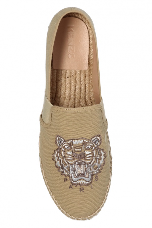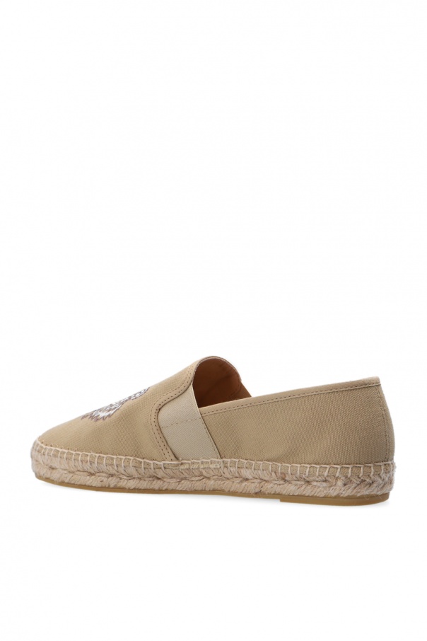 Beige espadrilles from Kenzo. Embroidered with the signature colorful tiger head motif, this pair is complete with elastic tape on the sides and a beige rubber sole.