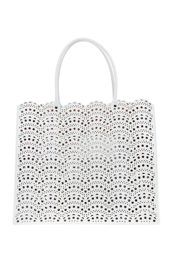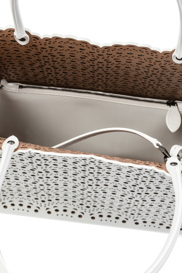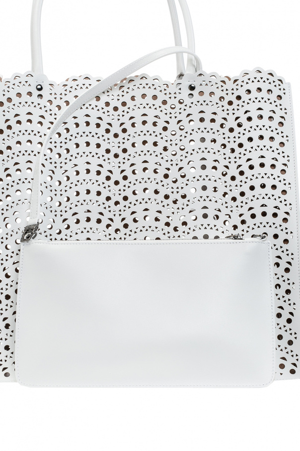 White ‘Garance 36’ hand bag from Alaia. Crafted from calf leather, this model features laser-cut details, two half-round handles, a detachable charm with a logo and mirror as well as one internal compartment with beige lining and a detachable zip pouch.