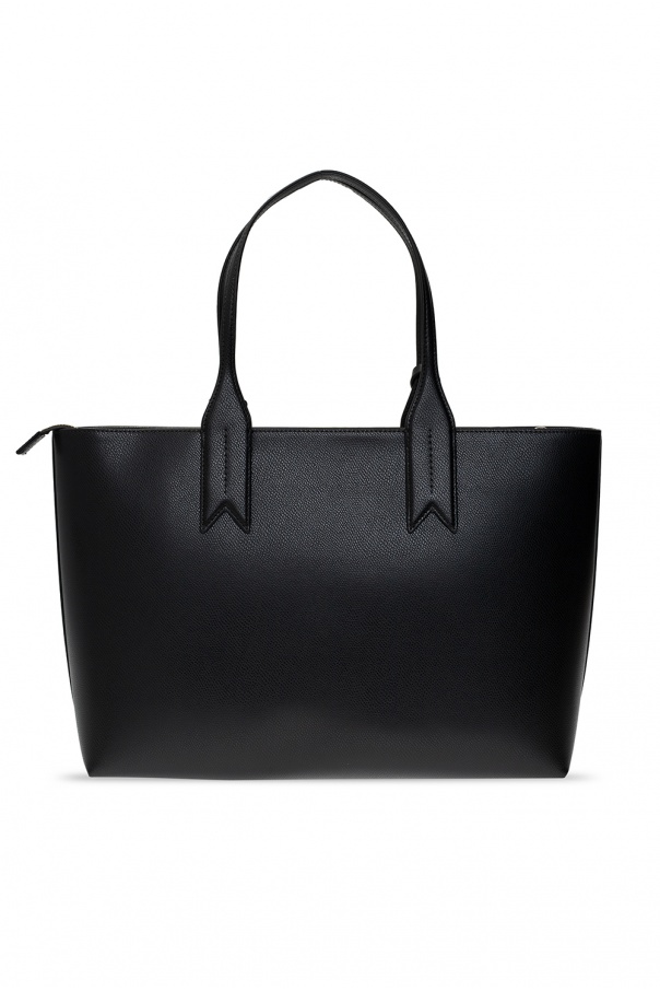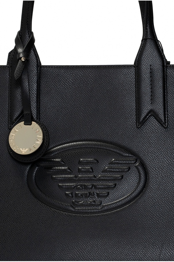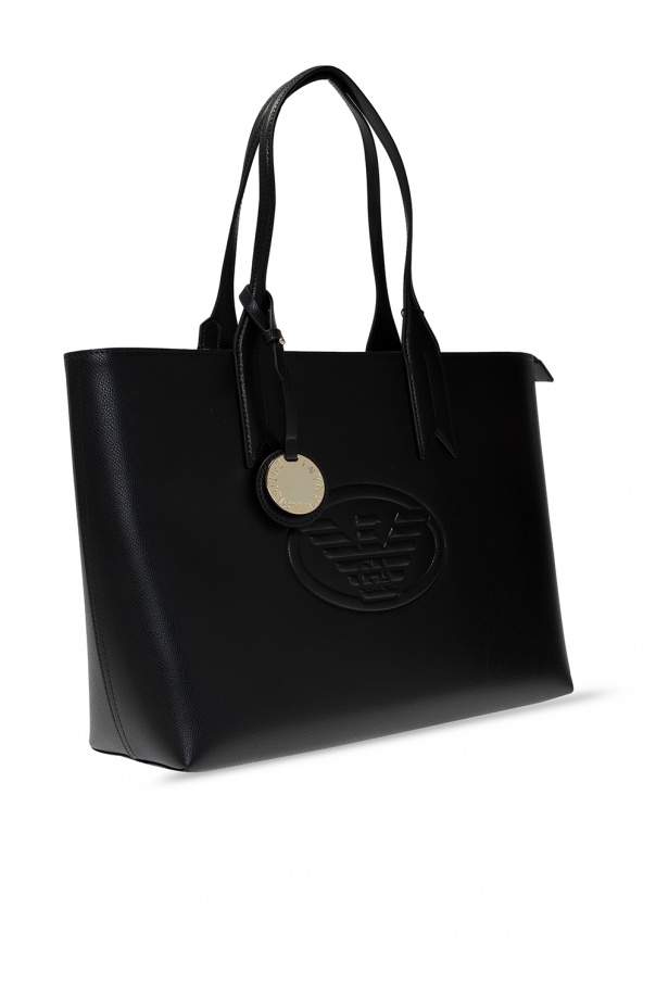 Black shopper bag from Emporio Armani. Fastened with a zip, this design features an embossed logo pattern, two half-round handles, gold-tone metal hardware and one internal compartment with one zip pocket.