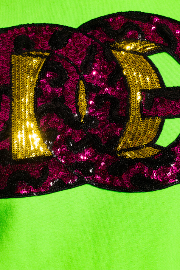 Neon green tank top from Dolce & Gabbana. Embellished with a gold-tone, pink and black sequinned logo appliqué, this style features an elasticated round neck.