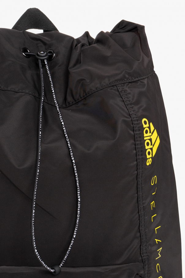 Black backpack from ADIDAS by Stella McCartney. Crafted from recycled material, this design cinches closed with drawstrings and features a printed yellow logo on the front, an external zip pocket, a back handle accompanied by shoulder straps and one internal compartment with a zip pocket.