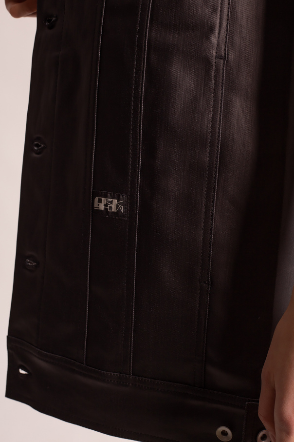 Black vest with raw edges from Rick Owens. Crafted from faux leather, this design features button fastenings, cut-out details, a logo patch and two buttoned flap pockets.