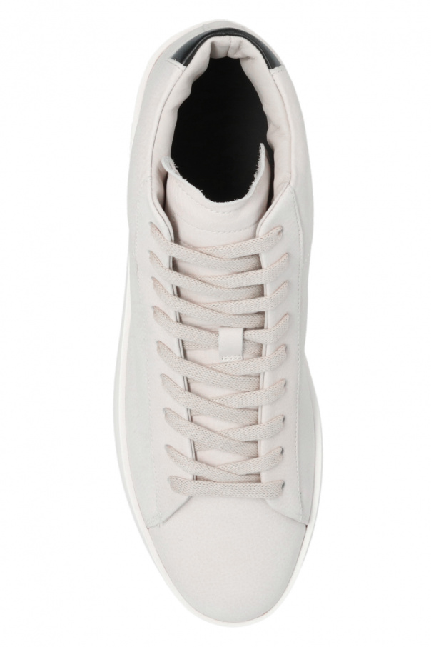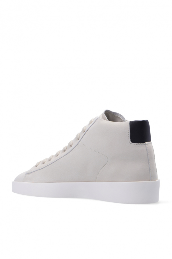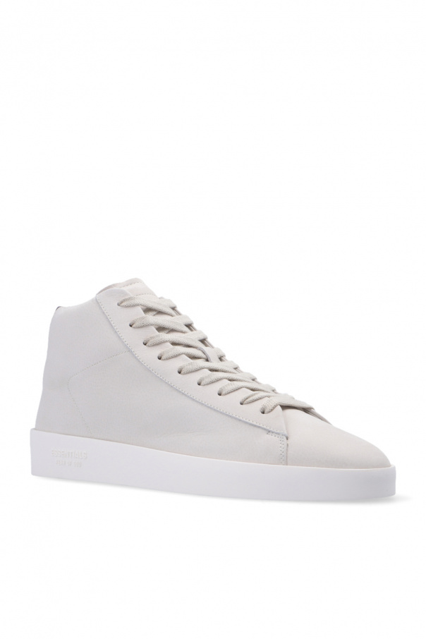 Light grey ‘Tennis Mid’ high-top sneakers from Fear Of God Essentials. Made of nubuck, this lace-up model features a black smooth leather heel counter and a white rubber sole accentuated with a tactile logo. Swappable shoelaces included.
