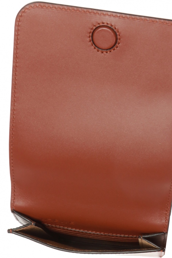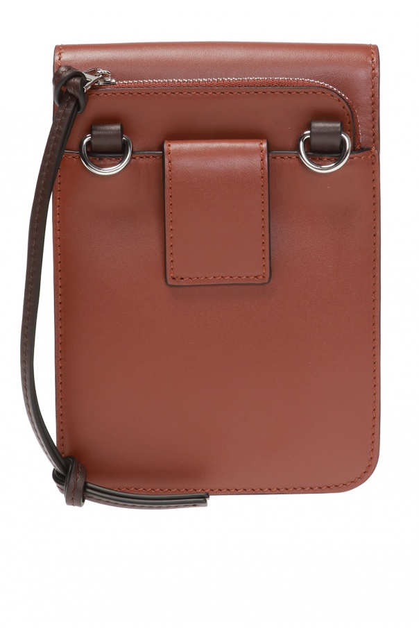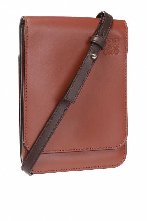Brown shoulder bag from Loewe. Made of leather. Magnetic snap fastening. Decorated with an embossed logo. Zip pocket at the back. Adjustable shoulder strap. Brown suede lining. One compartment and 3 card slots inside. Can be attached to a belt.