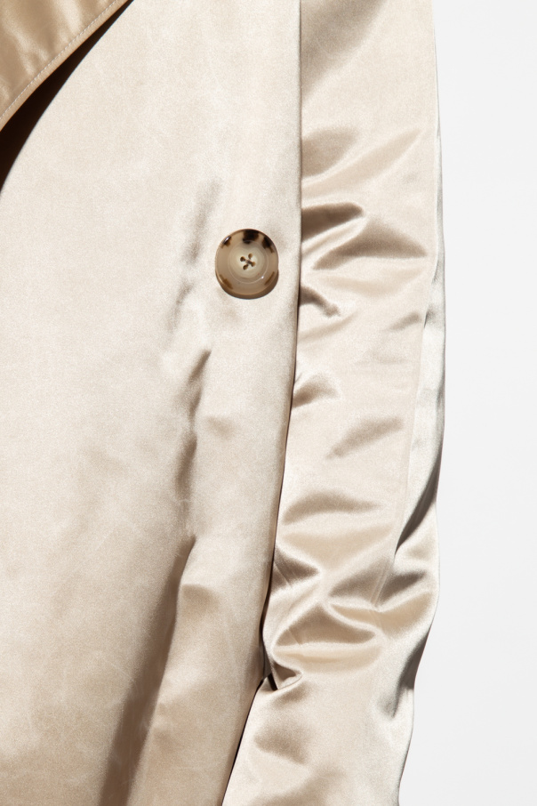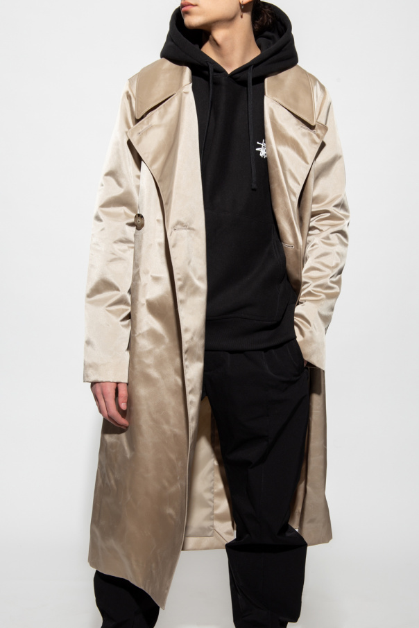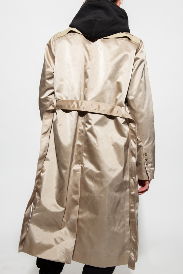 Beige trench coat from Rick Owens. Crafted from iridescent fabric with a double-breasted silhouette, this style features button fastenings, two frontal pockets, long sleeves and a single back vent. Belt included.