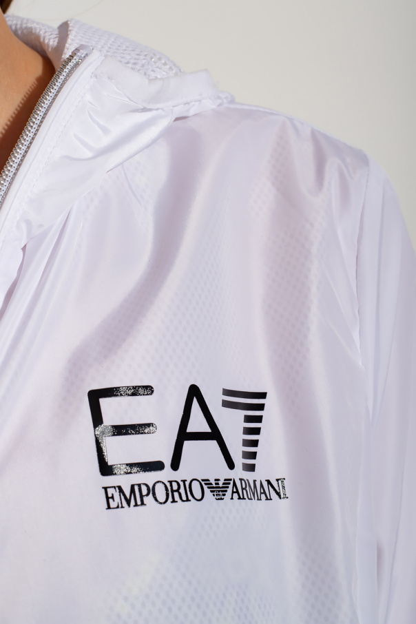 White hooded jacket from EA7 Emporio Armani. Fastened with a two-way zip, this garment features a black logo print, two zip pockets, mesh lining and ribbed cuffs.