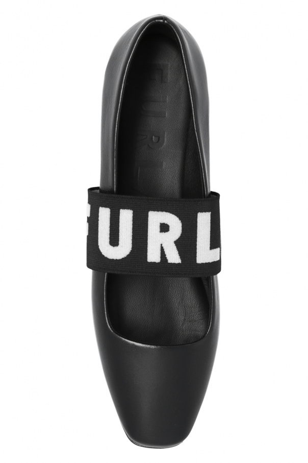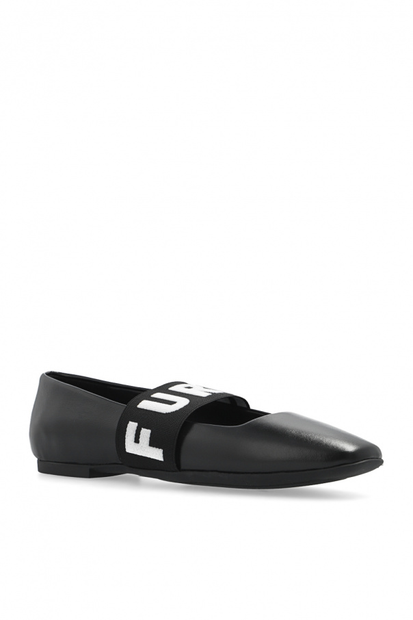 Black ‘Iris’ ballet flats from Furla. Made of leather, this model sits on a black rubber sole and features a distinctive, elasticated grosgrain strap embroidered with a white logo across the front
