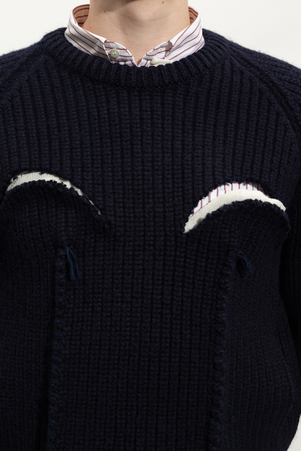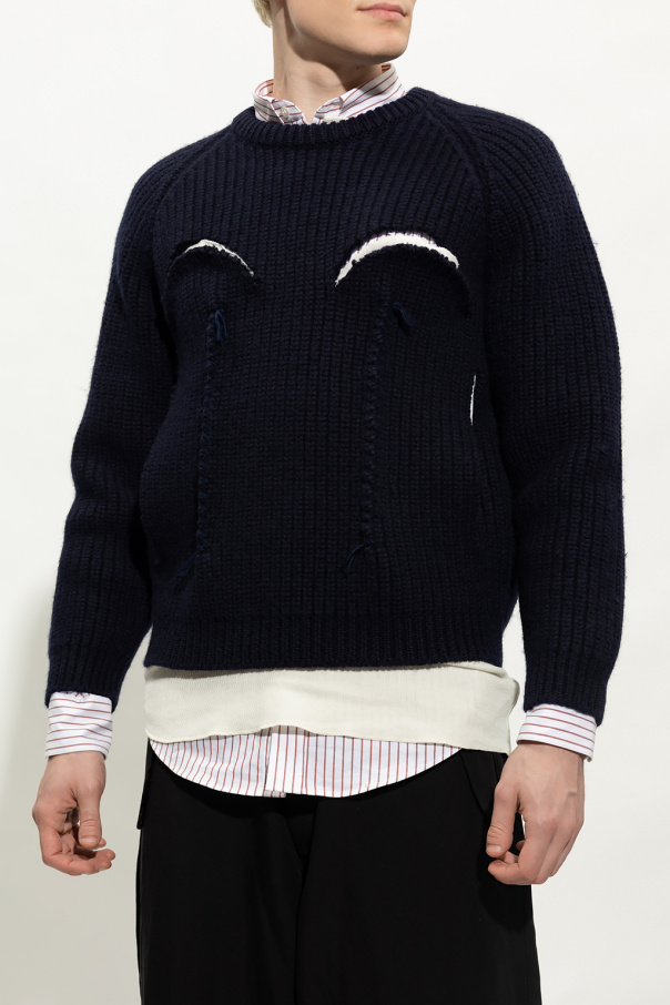 Navy blue three-layer sweater from Maison Margiela. Crafted from a cotton and wool blend with a vintage effect, this item features a round neck and two internal layers: cream and white with red pinstripes.