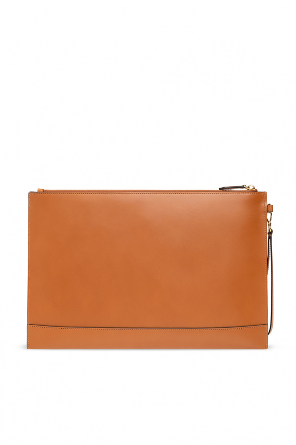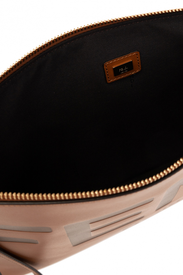 Brown pouch from Fendi. Crafted from leather, this design secures with a zip and showcases an embossed Fendi Roma logo on the front, a detachable wrist strap, gold-tone metal hardware and one internal compartment.